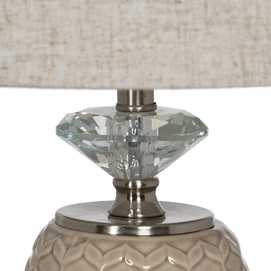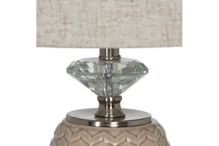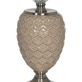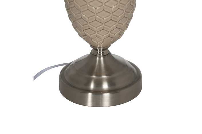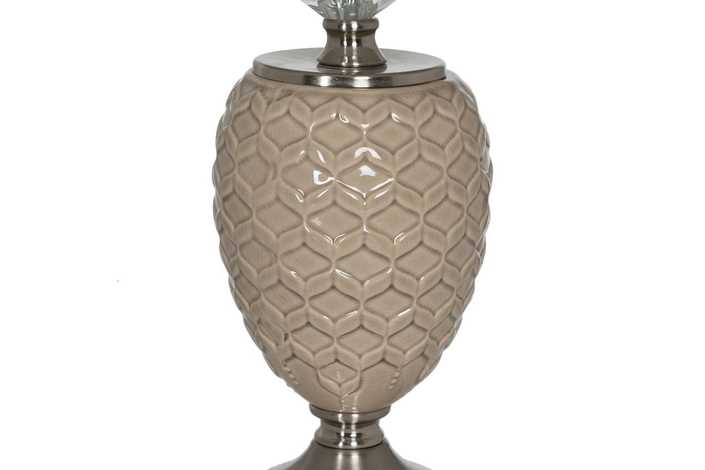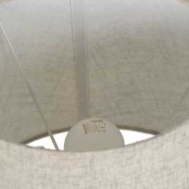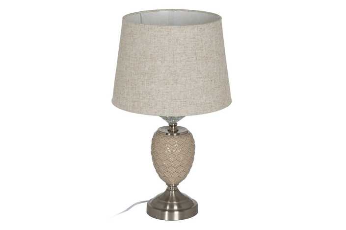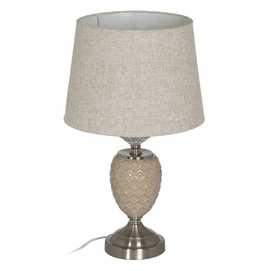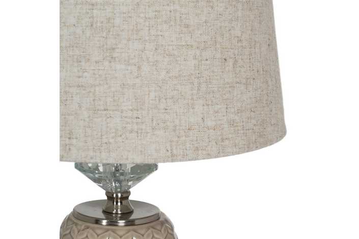 Material base: cerámica, cristal, metal. Material tulipa: 80% lino, 20% poliéster. Medida tulipa: 25x30x22.5cm. Medida base. 14x14x32cm. Voltaje: 220V. Casquillo: E27. Bombilla: 1*10W máx. led (no incluida). Longitud del cable: 180cm.