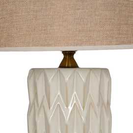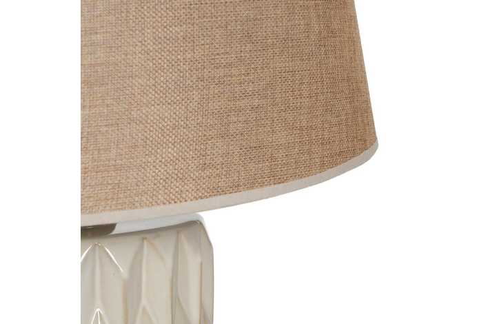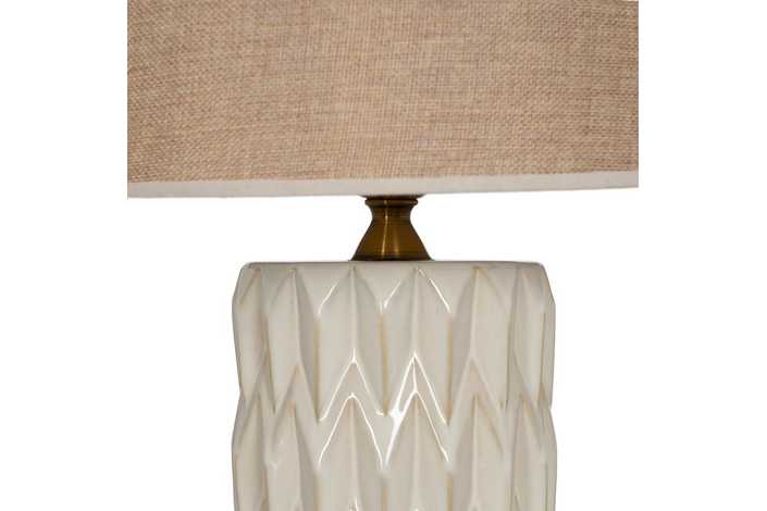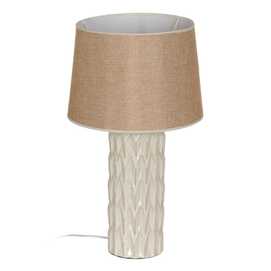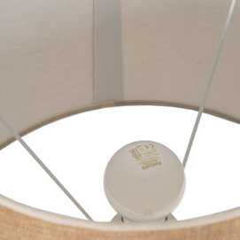 Base de porcelana, medidas: 16x16x37cm. Tulipa de tejido y metal, medidas: 35x35x25cm. Voltaje: 220-240V. Casquillo: E27. Bombilla: 1*60W máx (no incluida). Longitud del cable: 108cm.