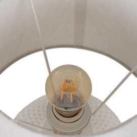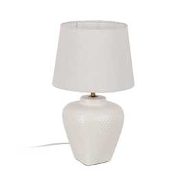 Base: cerámica, medidas 18x18x21cm. Pantalla: tejido (lino), medidas 25x20x18,5cm. Voltios: 220-240V. Casquillo: E27. Bombilla: 1*40W (no incluida). Longitud cable: 135cm.