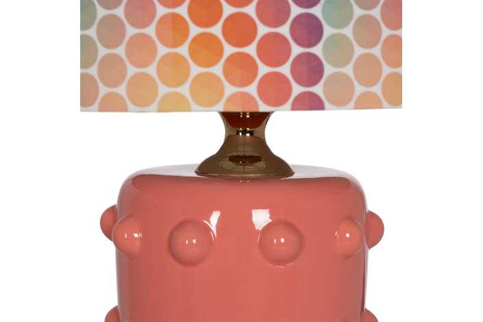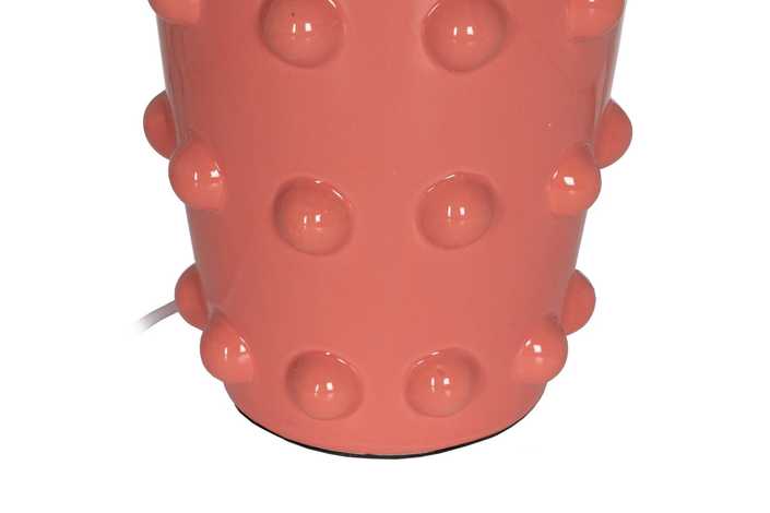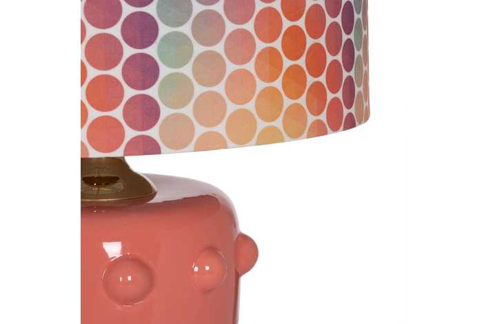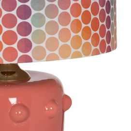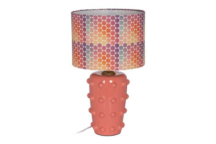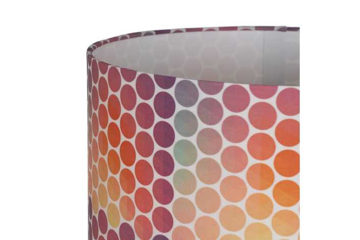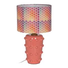 Base de cerámica, medidas: 21x21x34cm. Tulipa de tejido (100% poliéster) y metal, medidas:35,5x35,5x24,5cm. Voltaje: 230V. Casquillo: E27. Bombilla: 1*60W máx (no incluida). Longitud del cable: 200cm.