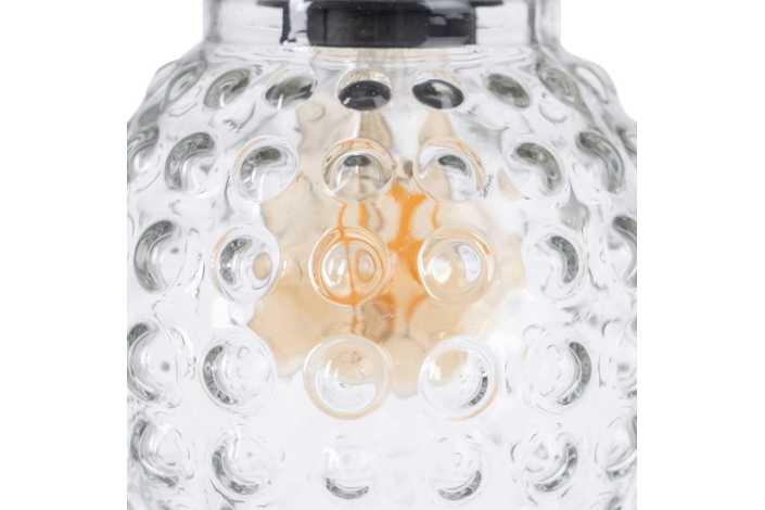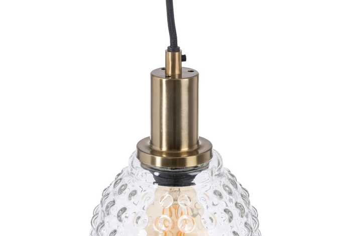 MATERIAL: CRISTAL, HIERRO, LATÓN. VOLTAJE: 220-240V CASQUILLO: E27 BOMBILLAS: 1 X 40W MÁX (NO INCLUIDAS). COLOR HIERRO: ORO VIEJO. COLOR CABLES: NEGRO. LARGO CABLE: 130 CM.
