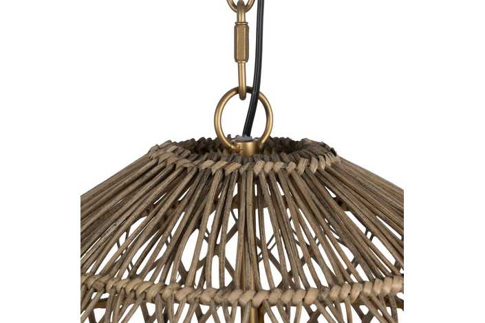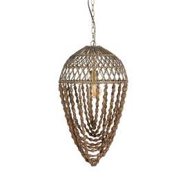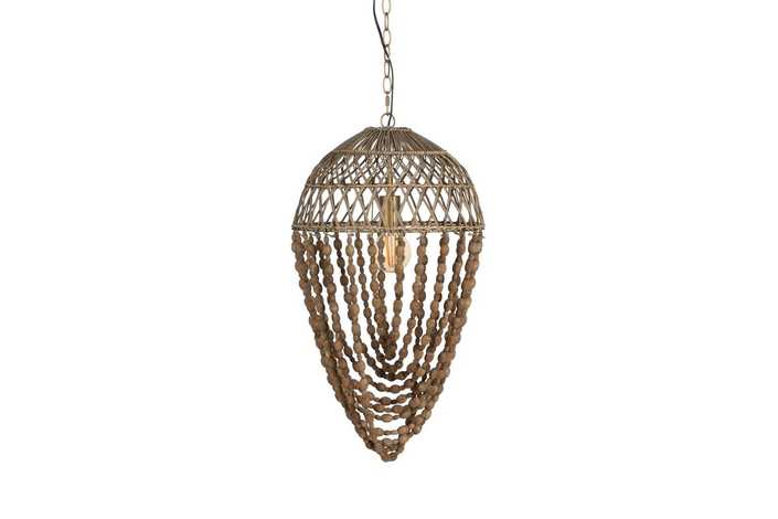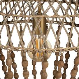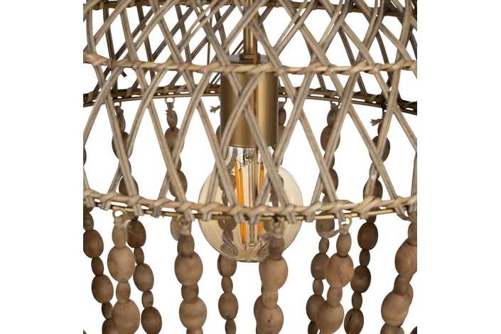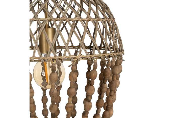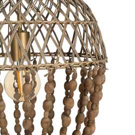 Material: Metal (estructura), madera Dm (cuentas) - ratán. Voltaje: 220-240V. Casquillo: E27. Bombilla: 1 x 40W(no incluída). Largo cadena: 65cm. Cable: negro. Medida largo cable: 80cm.