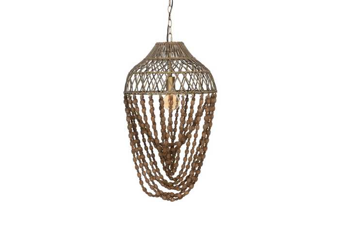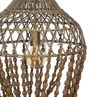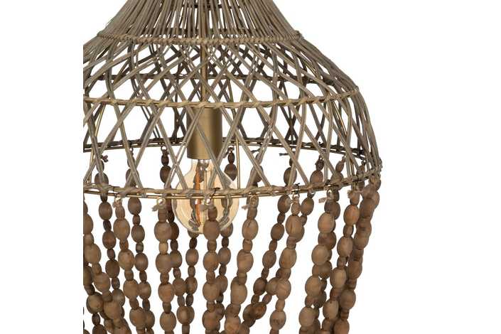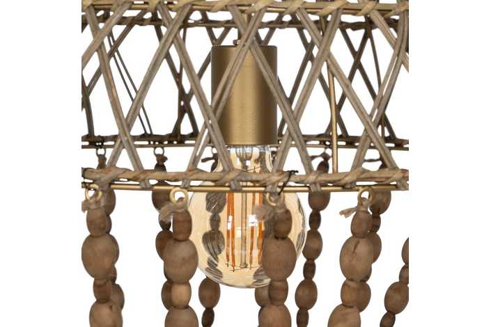 Material: Metal (estructura), madera Dm (cuentas) - ratán. Voltaje: 220-240V. Casquillo: E27. Bombilla: 1x 40W (no incluída). Largo cadena: 70cm. Largo cable: 70cm.