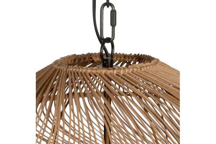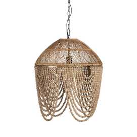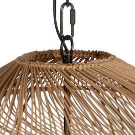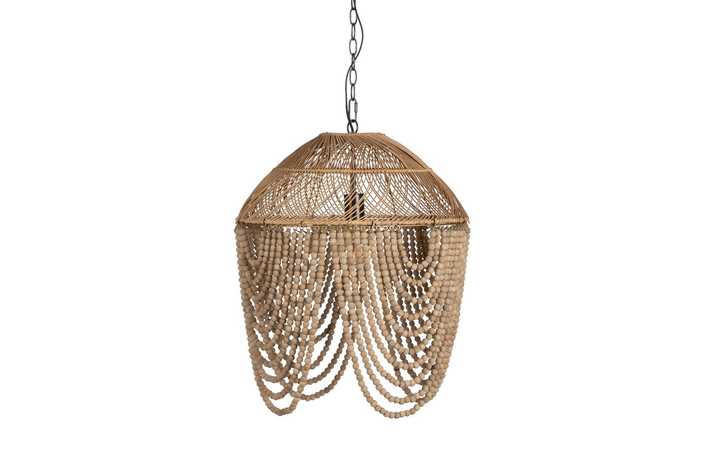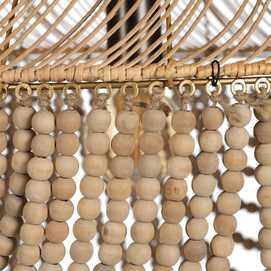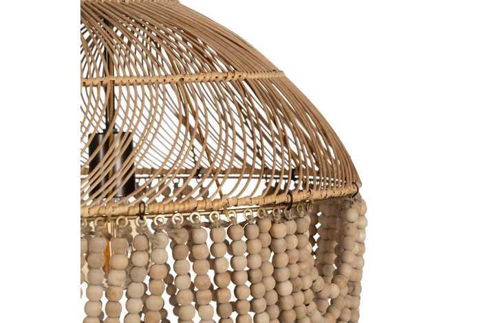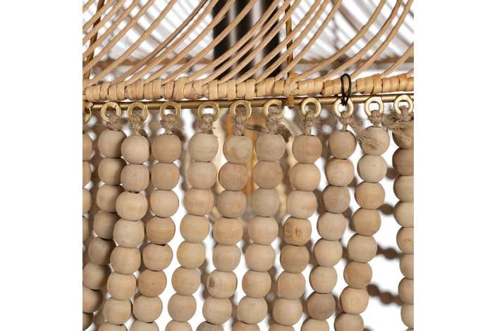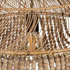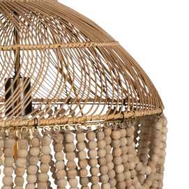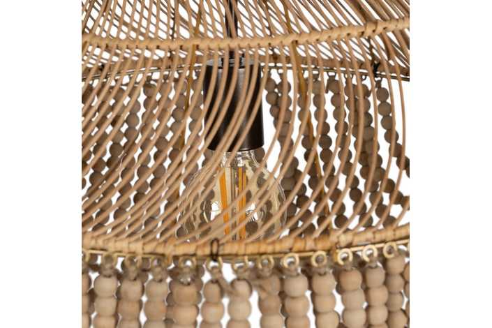 Material: Metal (estructura), madera Dm (cuentas) - ratán. Voltaje: 220-240V. Casquillo: E27. Bombilla: 1 x 40W(no incluída). Largo cadena: 65cm. Cable: negro. Medida largo cable: 80cm.