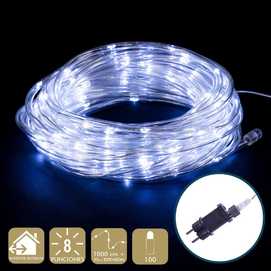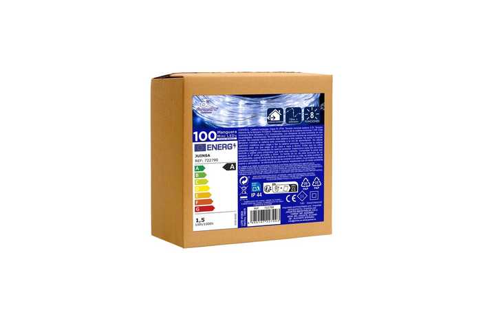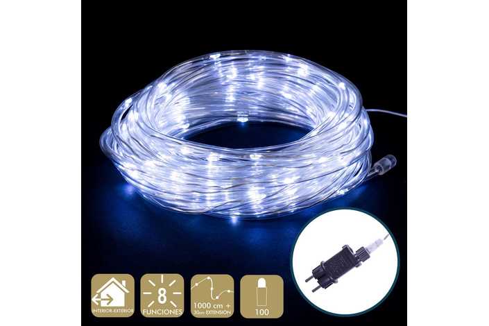 FUNCIONA CON LA RED ELÉCTRICA 20mA 1.5W. TRANSFORMADOR CON 8 FUNCIONES. IP44 (USO INTERIOR / EXTERIOR) CABLE TRANSPARARENTE DISTANCIA ENTRE BOMBILLAS: 10 CM. 100 LEDS DE LUZ FRÍA EXTENSIÓN DE CABLE: 3 METROS. ESTE PRODUCTO NO TIENE LA FUNCIÓN DE TEMPORIZADOR. PRESENTACIÓN EN CAJA MARRÓN.