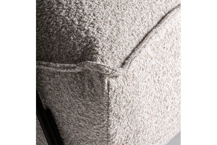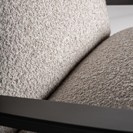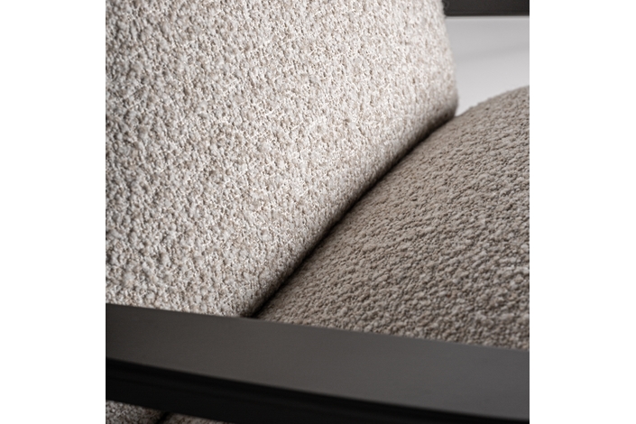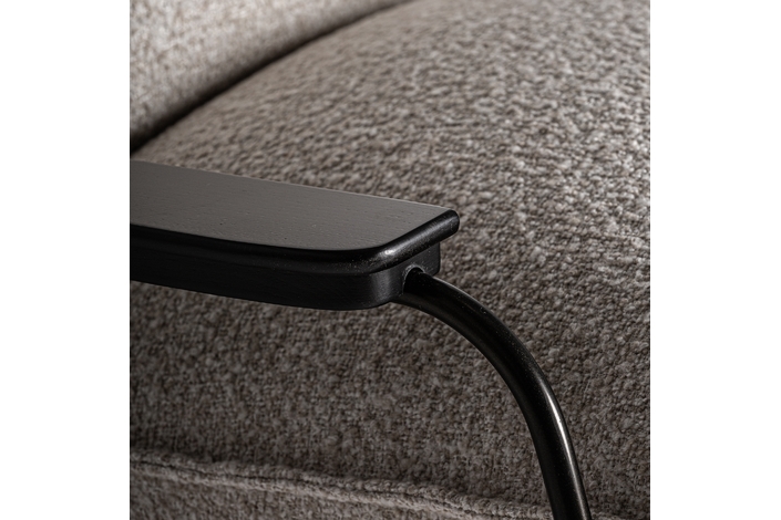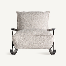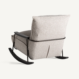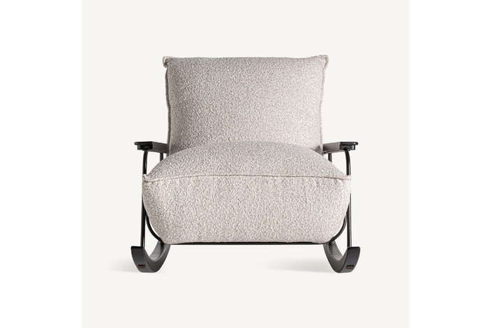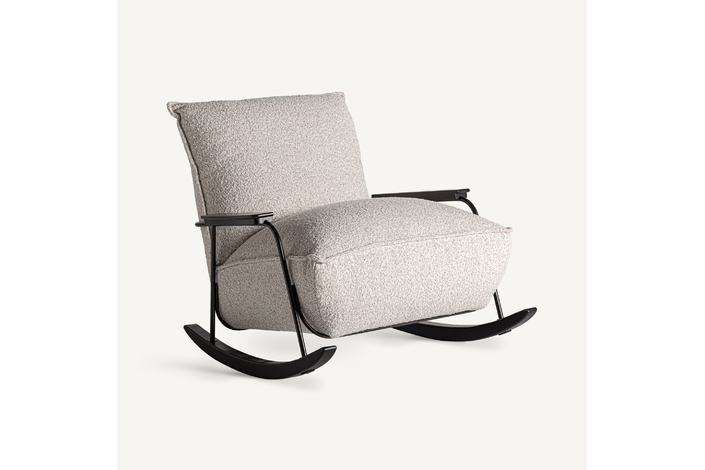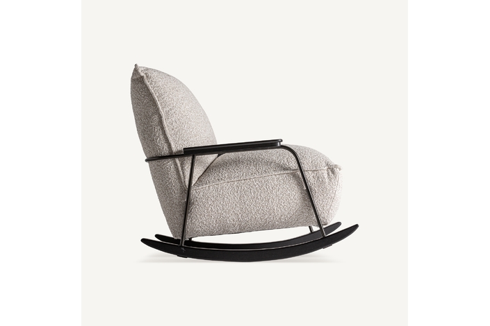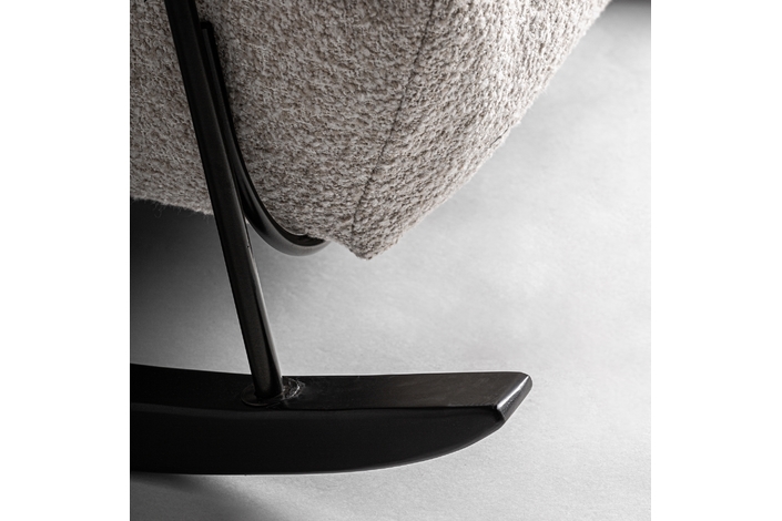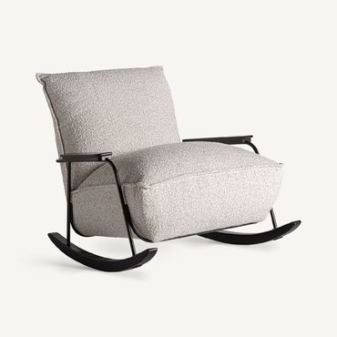 Mecedora zwalm, de estilo contemporáneo. Fabricado en madera de pino, en color negro, combinado con poliéster, en color beige jaspeado y madera de fresno, en color negro.