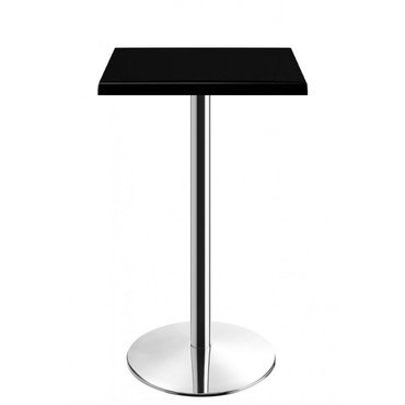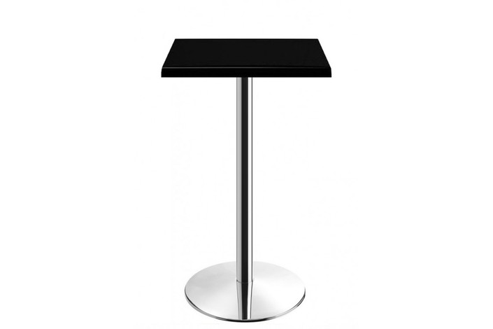 Mesa alta con pie central, acero inoxidable pulido - acabado brillo espejo -. Base circular de 45 cms y tapa de 60X60 cms, a elegir. Uso en interiores.