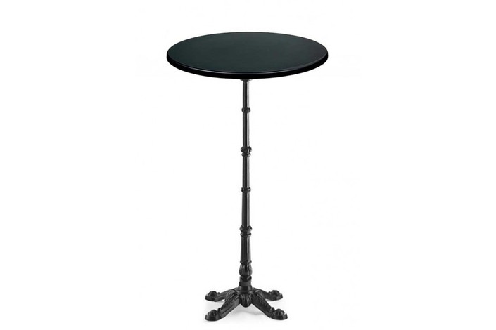 Mesa alta con base de fundición de hierro de 4 puntas, revestida con pintura de resina negro mate y tapa de 60 cms de diámetro, a elegir.