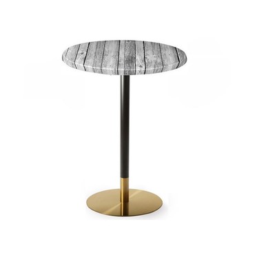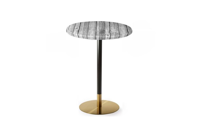 Mesa alta de diseño, multiusos, base de acero inoxidable acabado negro y dorado y tapa de 70 cms de diámetro a elegir.