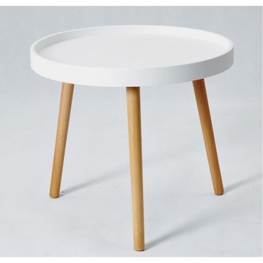 Mesa auxiliar baja de diseño, patas de madera de haya, tapa de polipropileno de color blanco. Otros colores disponibles.