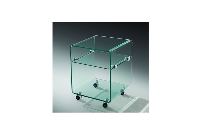 Mesa baja de diseño, ruedas, estantes, cristal curvado.