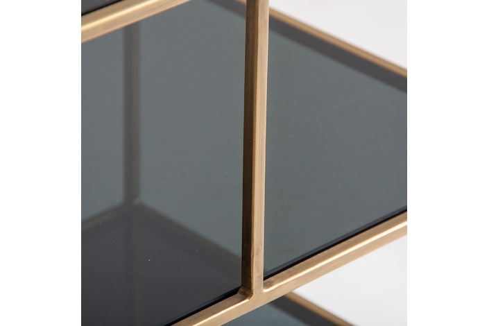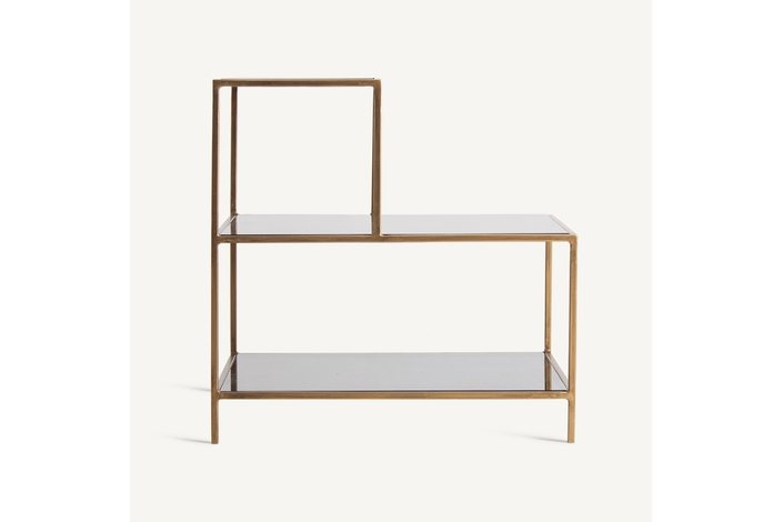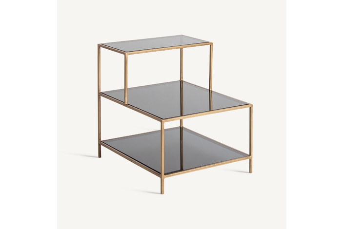 Mesa auxiliar batorz, en color negro/oro, de estilo art deco. Fabricado en hierro, combinado con cristal. Producto desmontable.