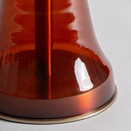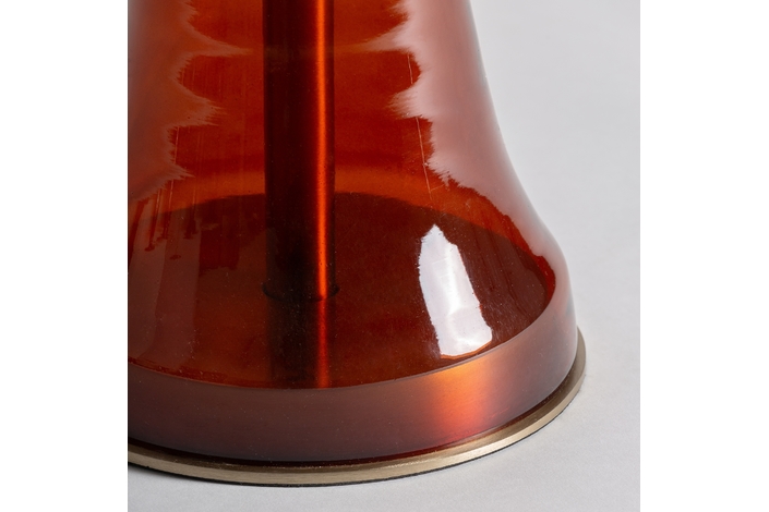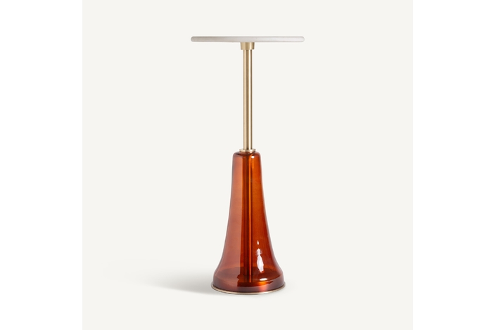 La mesa auxiliar Colmar, con una silueta esbelta y un acabado en vidrio ámbar, aporta calidez y estilo, realzada por detalles metálicos dorados y una superficie refinada.