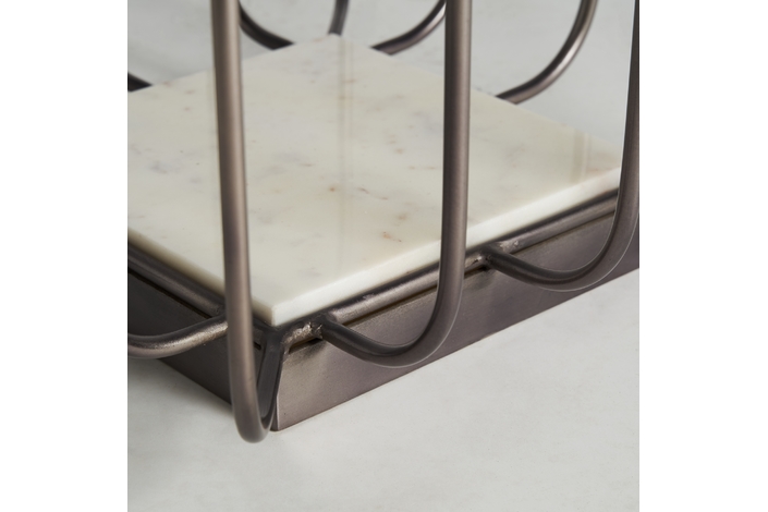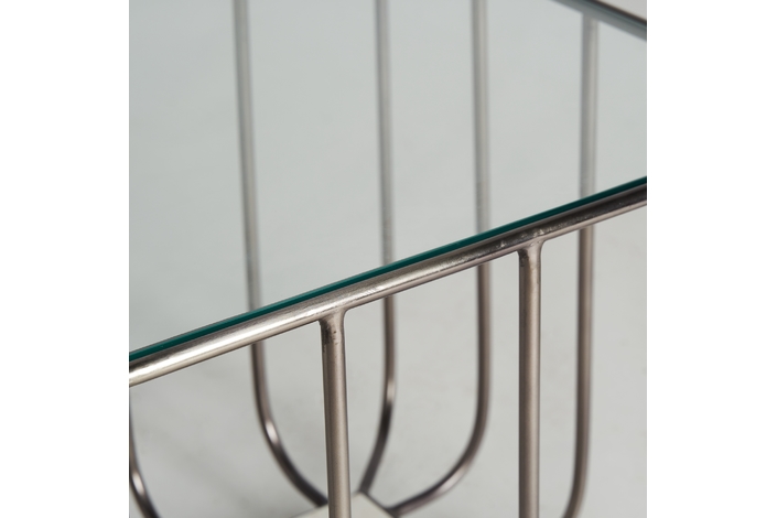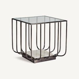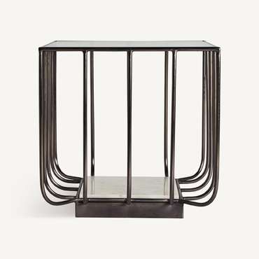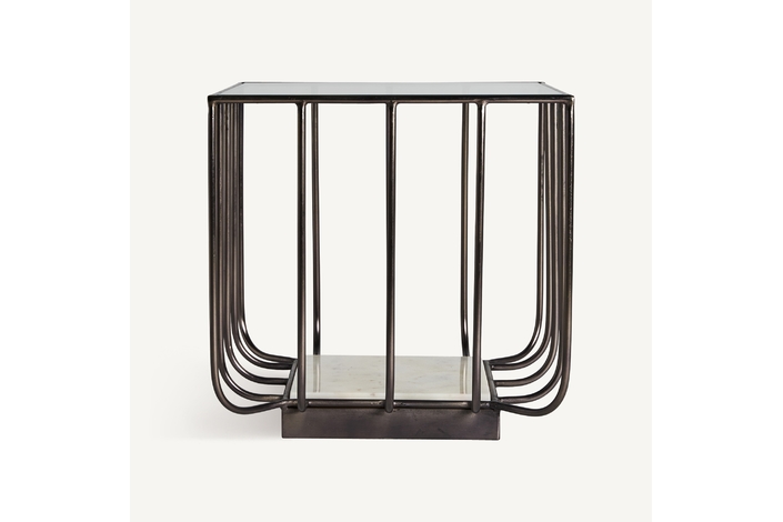 Mesa auxiliar creteil, en color plata viejo, de estilo art deco. Fabricado en hierro, combinado con mármol y cristal. Producto desmontable.