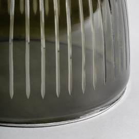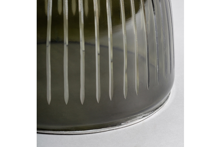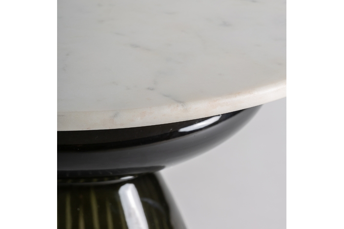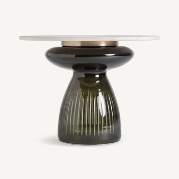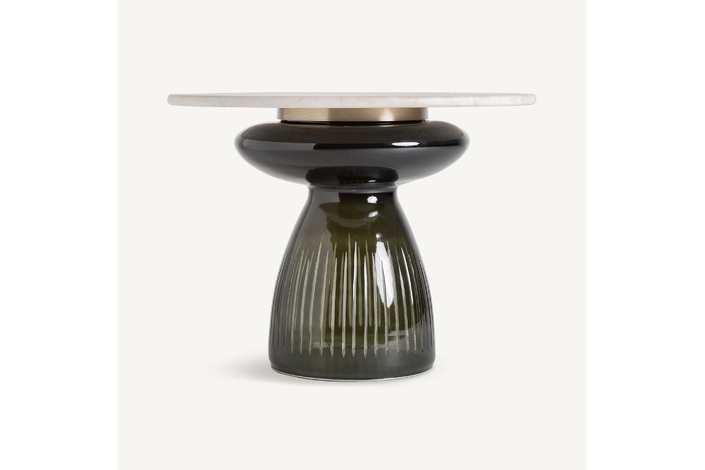 La mesa auxiliar Hallstatt, con una base de vidrio oscuro acanalado y una tapa de mármol, destaca por su diseño distintivo, logrando un equilibrio armonioso entre texturas y materiales.