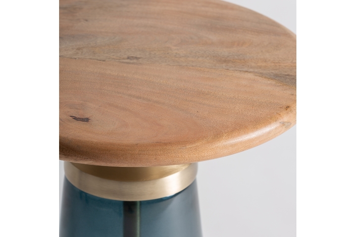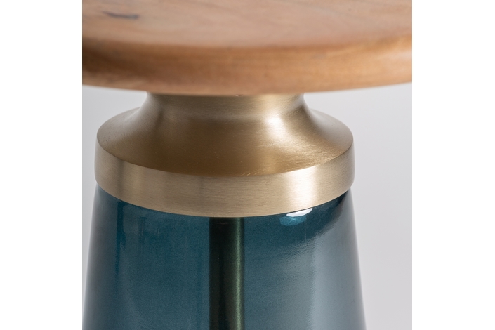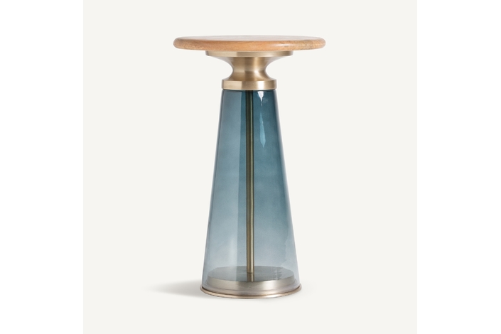 La mesa auxiliar Haugan, con una base de vidrio cónico en un elegante tono azul degradado y una tapa de madera natural, combina sofisticación y modernidad con un toque artesanal.