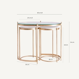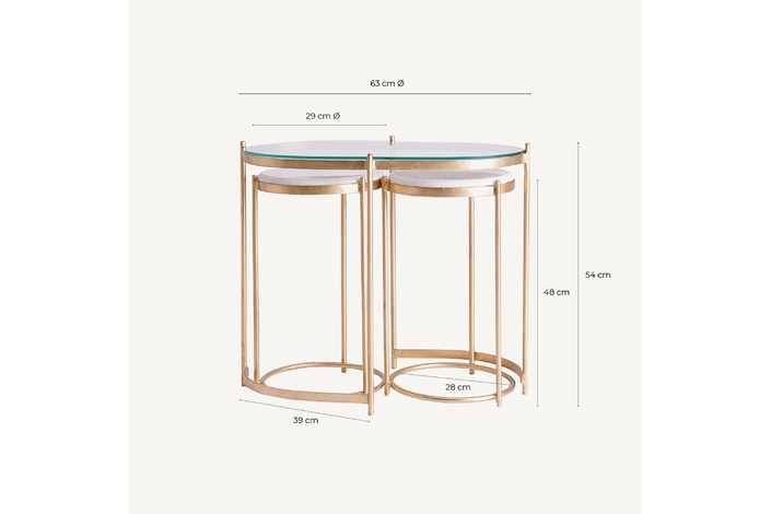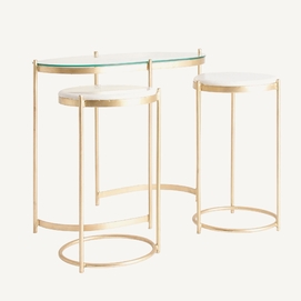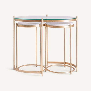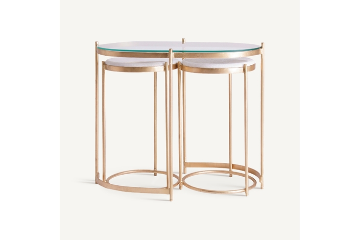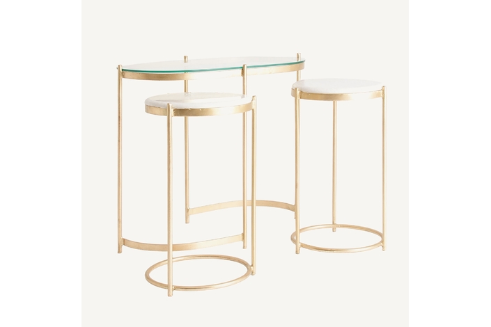Mesa auxiliar j/3 kruth, en color oro viejo, de estilo art deco. Fabricado en hierro, combinado con vidrio y mármol. Producto desmontable.