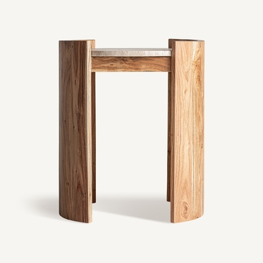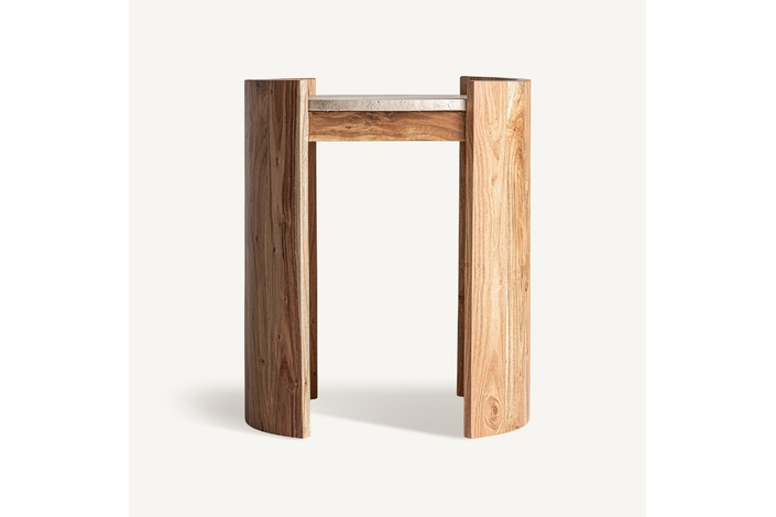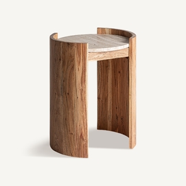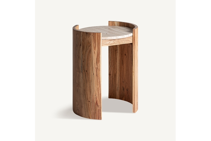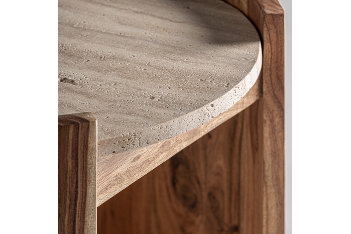 Mesa auxiliar noyers, en color marrón, de estilo art deco. Fabricado en travertino, combinado con madera de acacia. Producto desmontable.