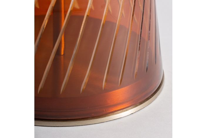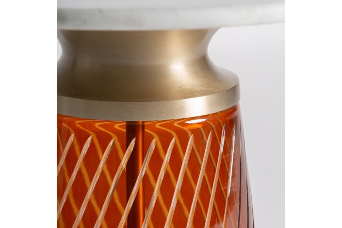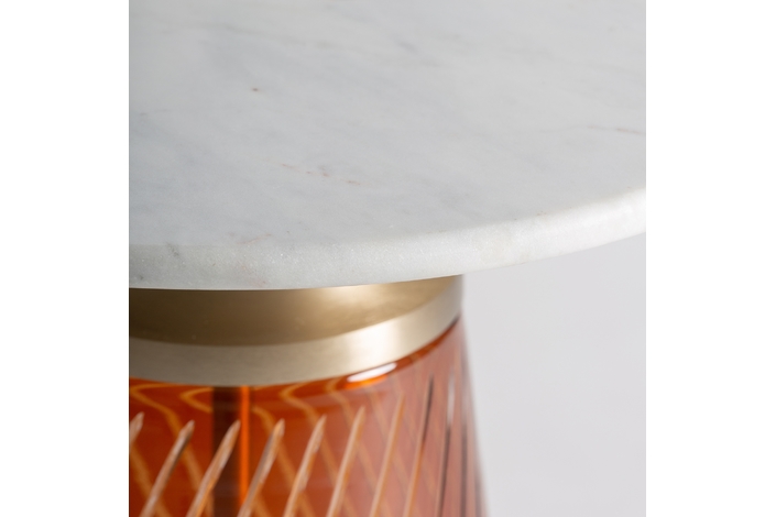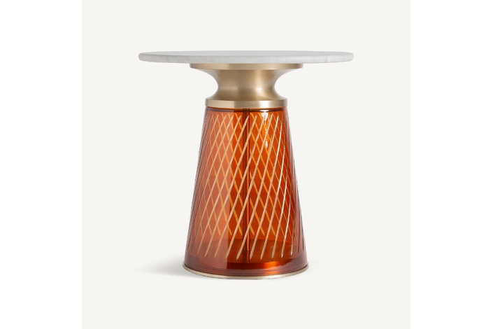 Con un encanto que evoca el glamour del art déco, la mesa auxiliar Orvos destaca por su diseño escultural y sofisticado. Su base de vidrio en color ámbar profundo, trabajada con esmero, crea un juego de luces cálido y acogedor. La tapa de mármol blanco se funde con detalles en acero dorado, dando como resultado una pieza de carácter atemporal, ideal para espacios con personalidad.