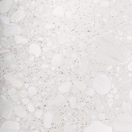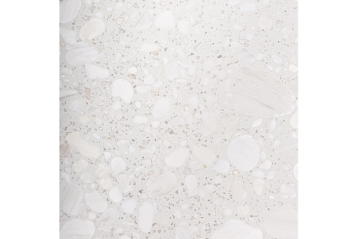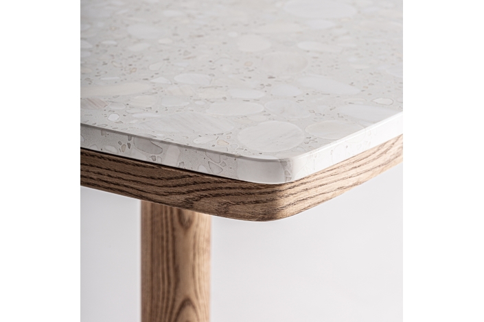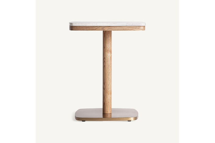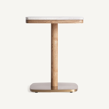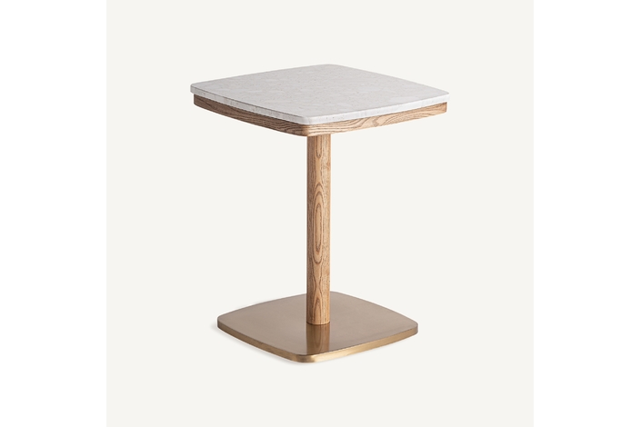 Mesa bar alferce, en color blanco/oro, de estilo art deco. Fabricado en terrazo, combinado con acero y madera.