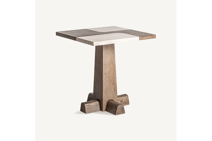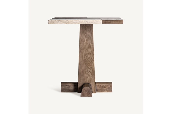 Mesa bar karpacz, de estilo contemporáneo. Fabricado en madera roble, en color marrón, combinado con travertino, en color beige.