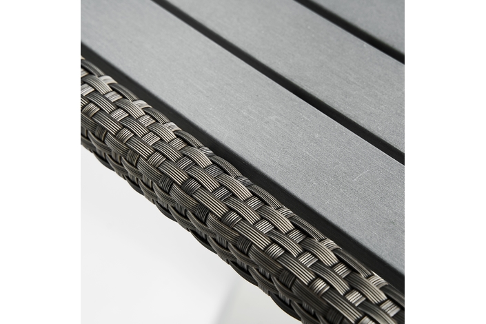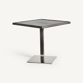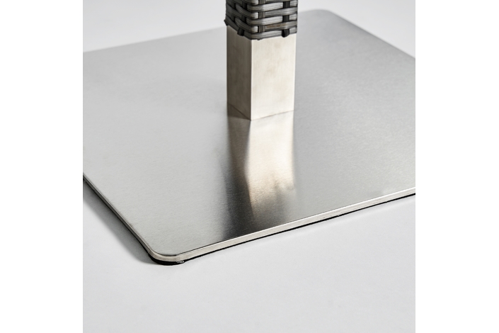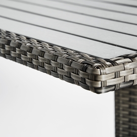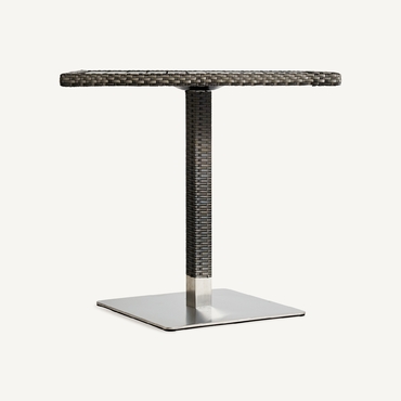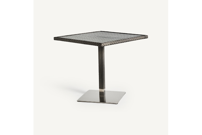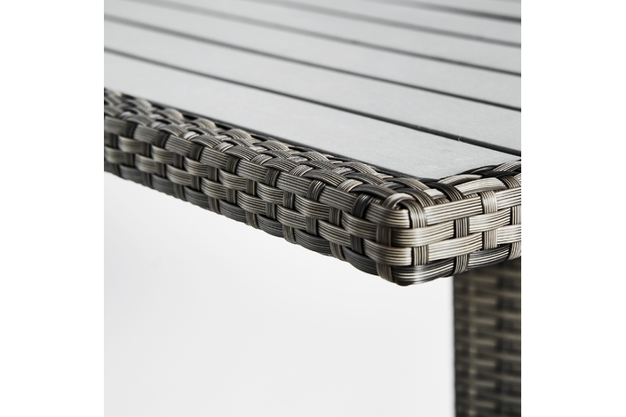 Mesa bar walnut, en color plata, de estilo contemporáneo. Fabricado en aluminio, combinado con ratán y plástico. Producto desmontable.