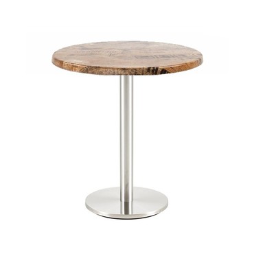 Mesa con pie central, acero inoxidable pulido - acabado satinado -. Base circular de 45 cms y tapa de 70 cms de diámetro, a elegir. Uso en interiores.