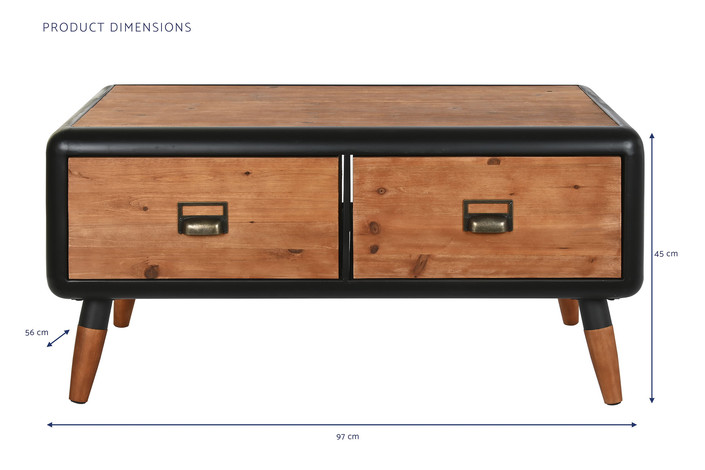 Dimensiones (cm) Longitud 97  |  Fondo 56  |  Altura 45 Peso neto producto (kg) 15,50 Material Abeto  |  Metal