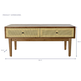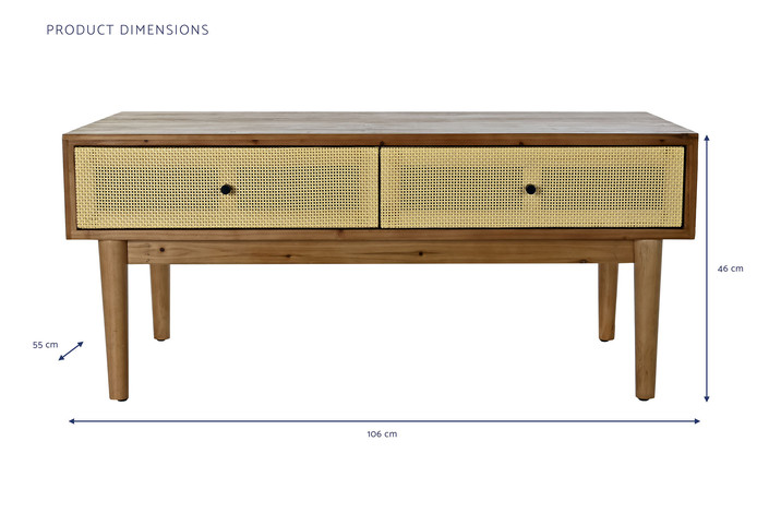 Dimensiones (cm) Longitud 106  |  Fondo 55  |  Altura 46 Peso neto producto (kg) 11,50 Material Abeto  |  Ratan