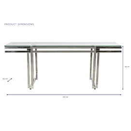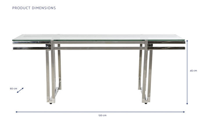 Dimensiones (cm) Longitud 120  |  Fondo 60  |  Altura 45 Peso neto producto (kg) 19,20 Material Inox  |  Cristal
