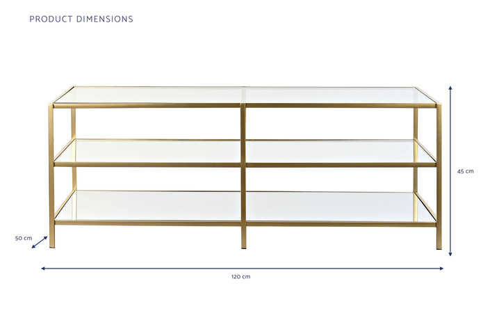 Dimensiones (cm) Longitud 120  |  Fondo 50  |  Altura 45 Peso neto producto (kg) 27,00 Material Metal  |  Espejo