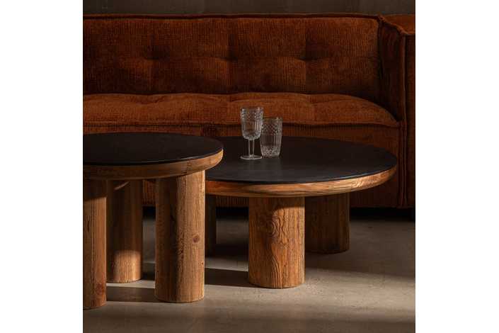 Material: madera de pino reciclada, chapa de roble. Grosor tablero: 5cm. Altura patas: 30cm.
