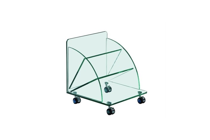 Mesa baja de diseño, ruedas, cristal curvado.