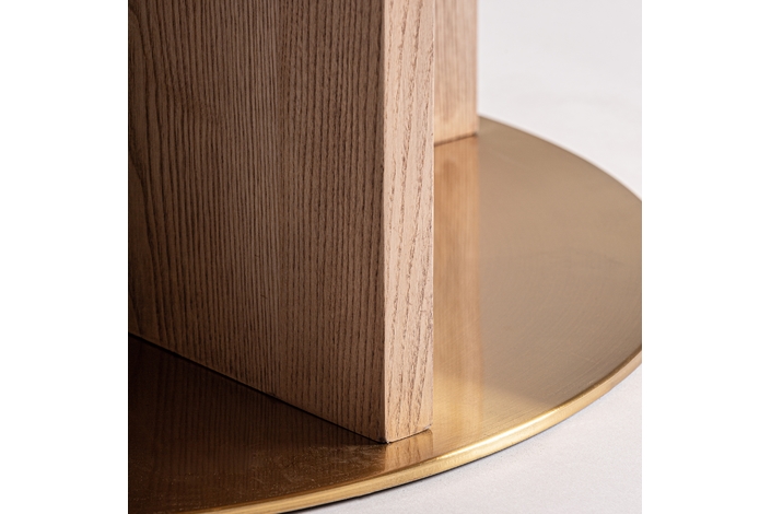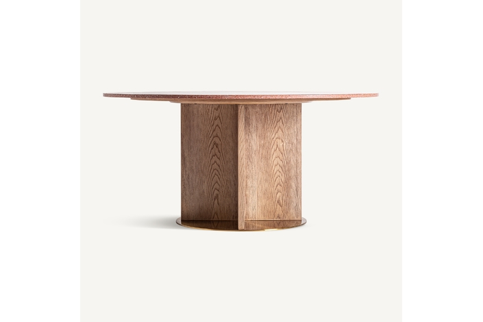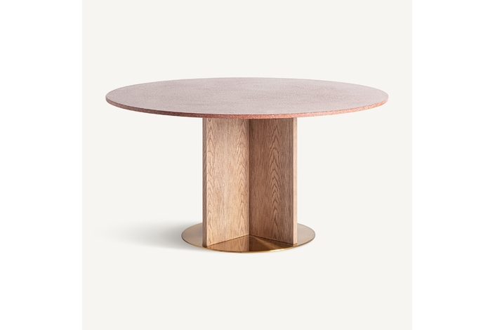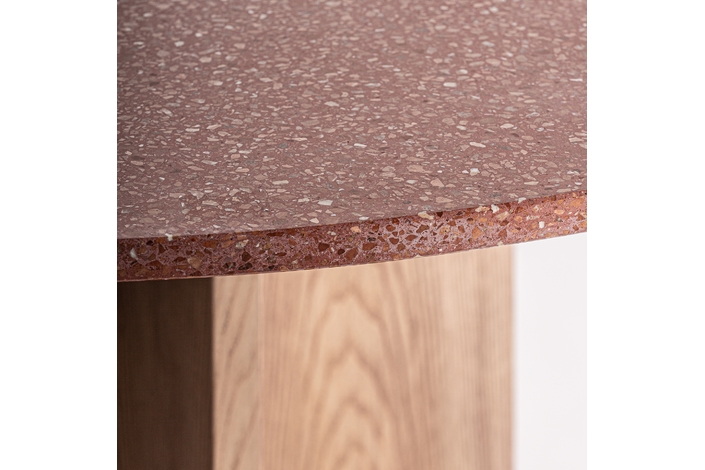 Mesa comedor alferce, en color rojo/oro, de estilo art deco. Fabricado en terrazo, combinado con acero y madera de abeto. Producto desmontable.