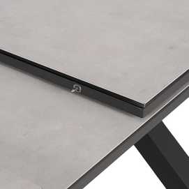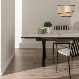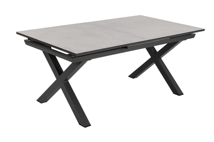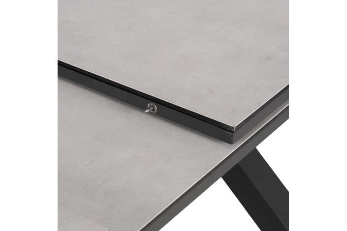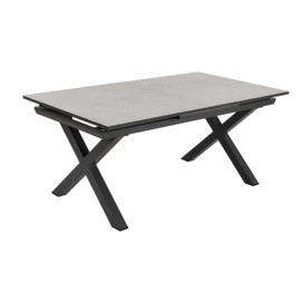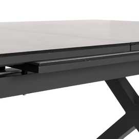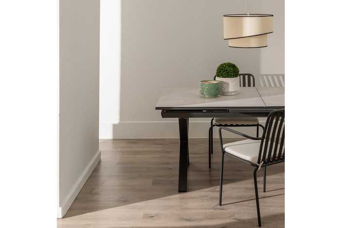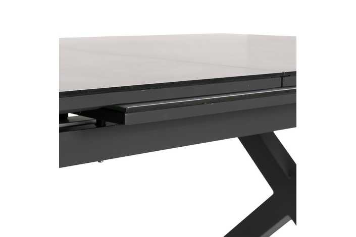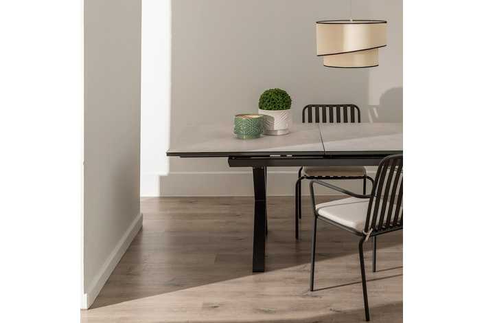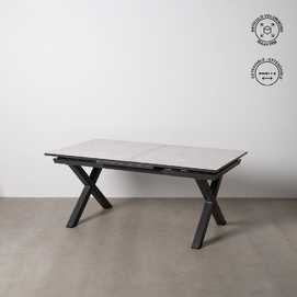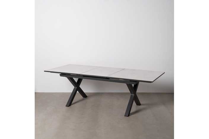Mesa extensible, de 180cm a 240cm (+60cm). Material: cristal con cerámica, patas de aluminio.