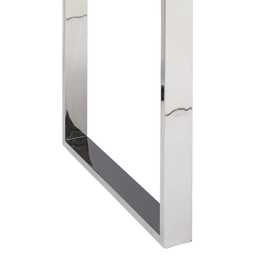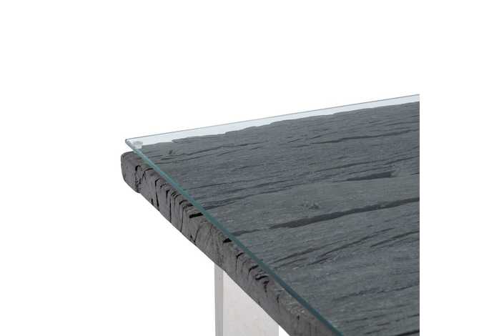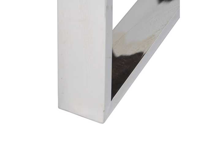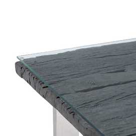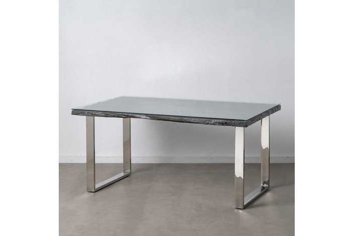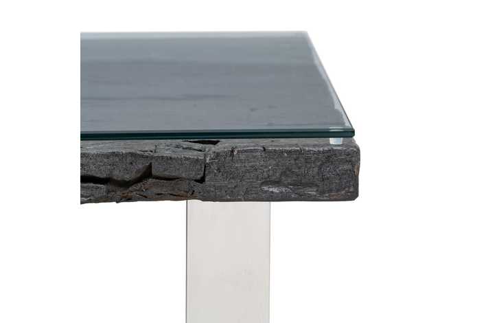 Material: madera, cristal, acero inoxidable. Grosor sobre (madera + cristal): 6cm. Distancia entre las patas: 132cm.