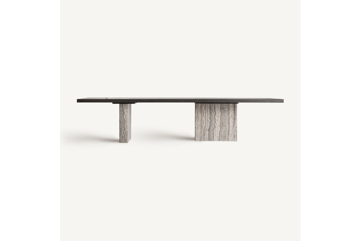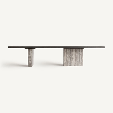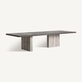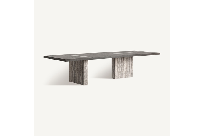 Mesa comedor Rignac de estilo contemporáneo, fabricado en travertino en color gris, combinado con madera de fresno en color marrón y latón. Producto desmontable.