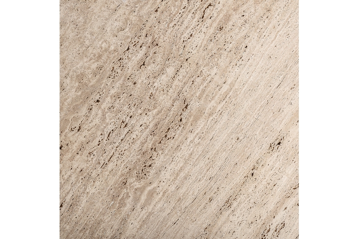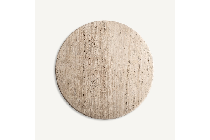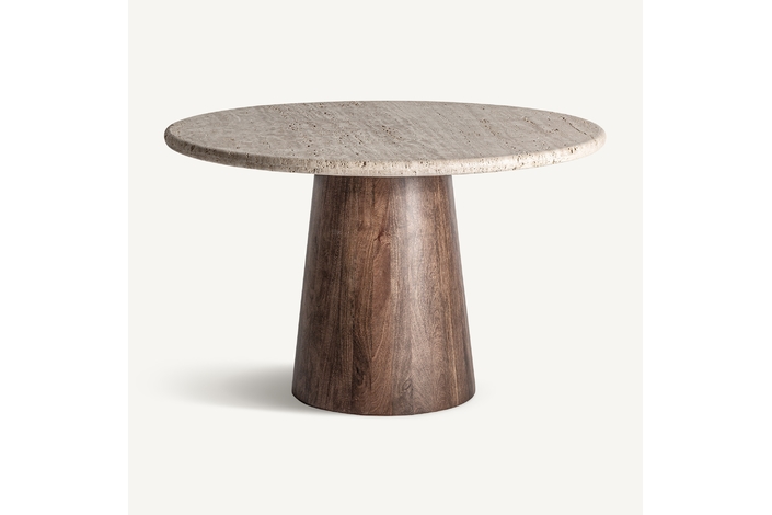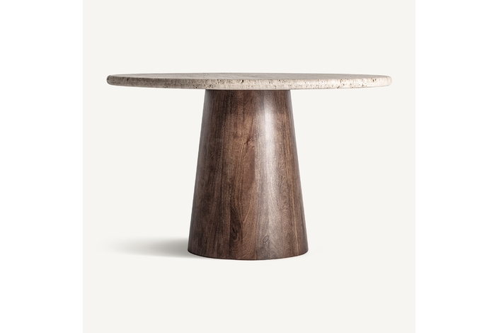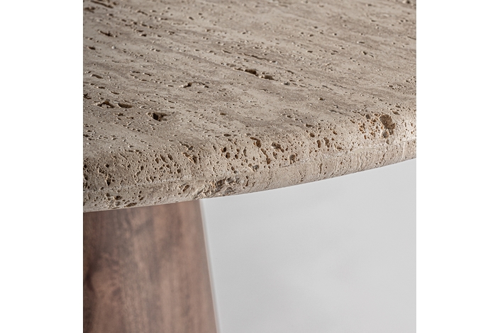Mesa comedor Varzi de estilo art deco, fabricado en travertino en color beige, combinado con madera de mango en color marrón. Producto desmontable.