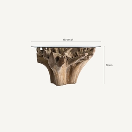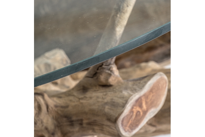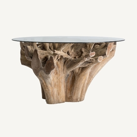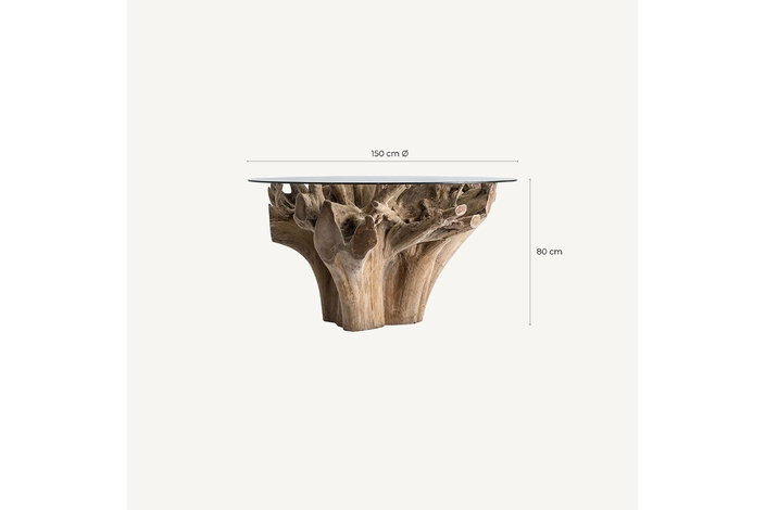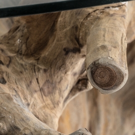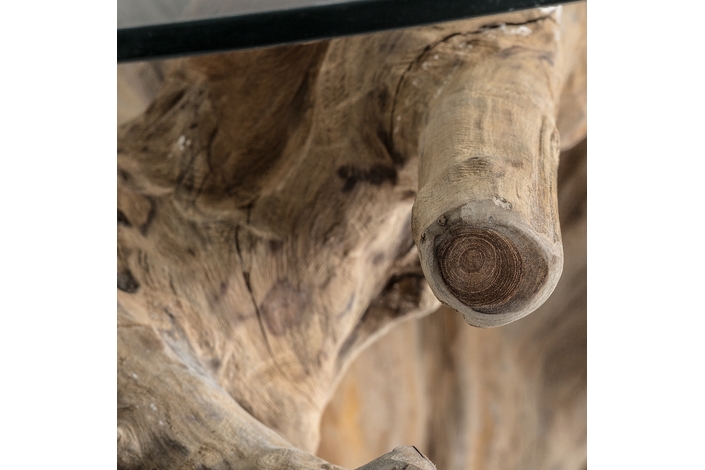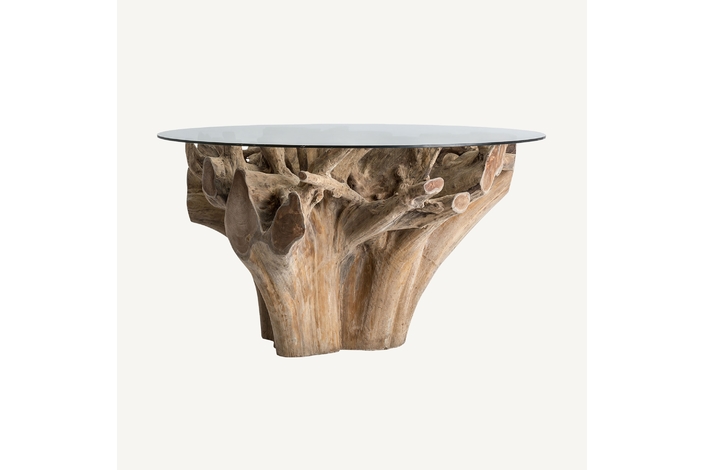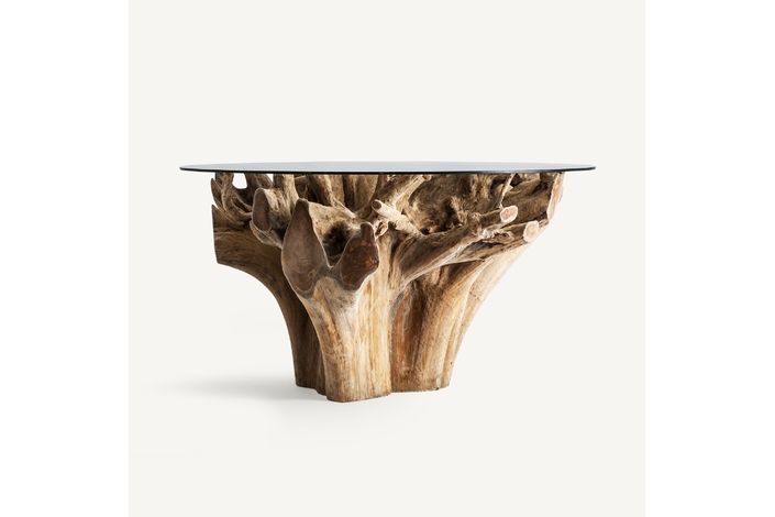 Mesa comedor warri, en color marrón artesanal, de estilo étnico. Fabricado en raíz teka, combinado con vidrio.