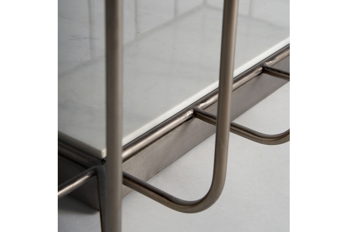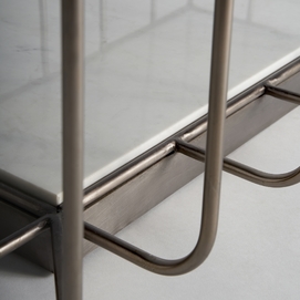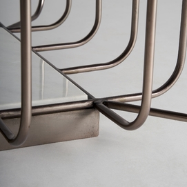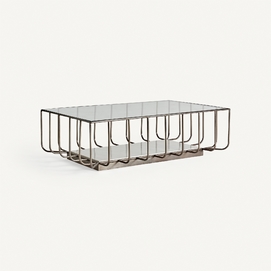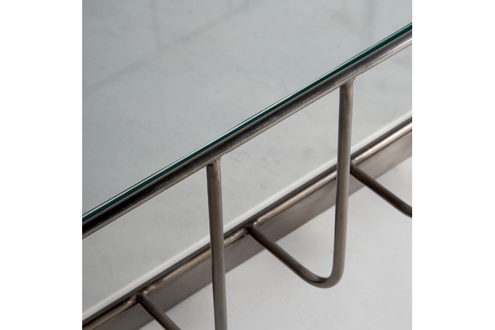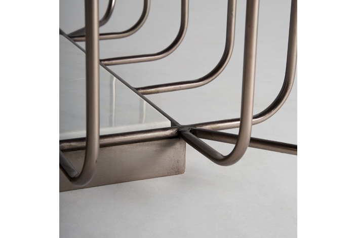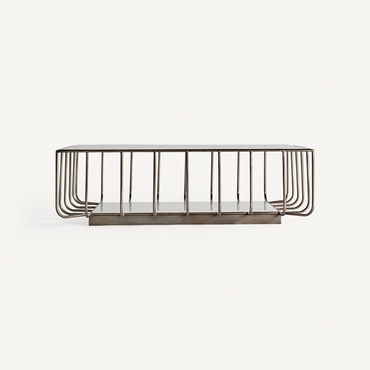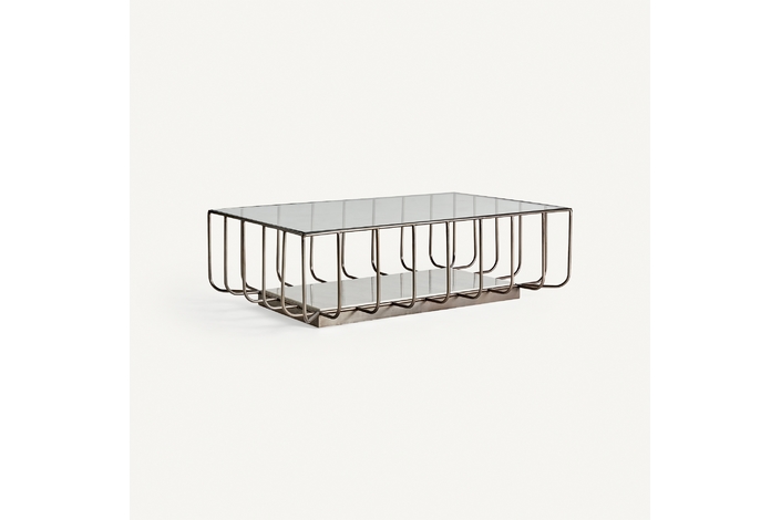 Mesa de centro linthal, en color cobre, de estilo art deco. Fabricado en hierro, combinado con vidrio y mármol. Producto desmontable.