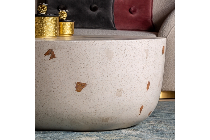 La Mesa de Centro Massa de VICAL home, con su superficie de terrazo blanco y dimensiones de 90x90x40cm, es un reflejo de sofisticación. Fabricada artesanalmente, cada mesa de terrazo blanco presenta variaciones que la hacen única. Este mueble no solo complementa tu espacio, sino que introduce una pieza de conversación llena de carácter y elegancia.