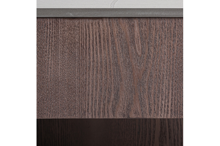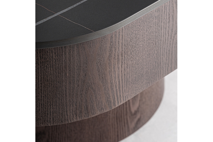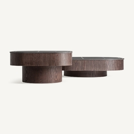 Mesa de centro Neufs de estilo art deco, fabricado en mármol sintético en color negro, combinado con madera contrachapada en color marrón.