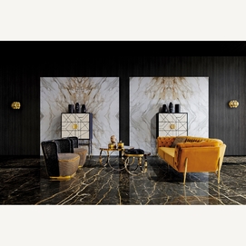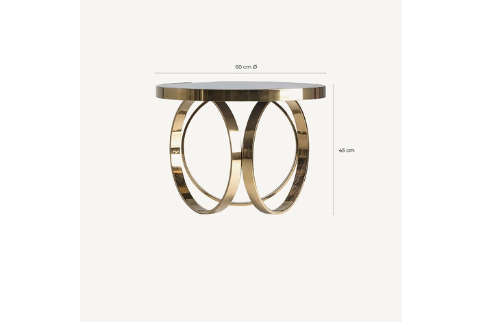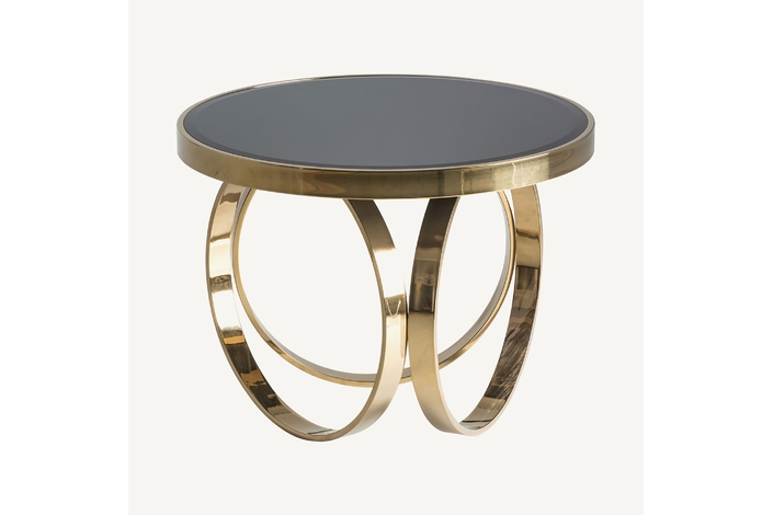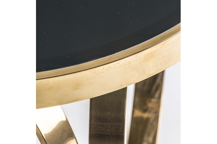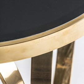 Mesa de centro reda, en color negro/oro, de estilo clásico. Fabricado en espejo, combinado con acero y vidrio. Producto desmontable.