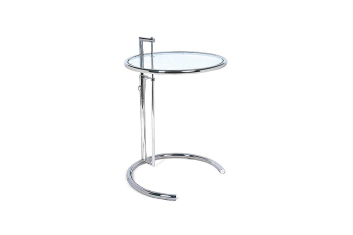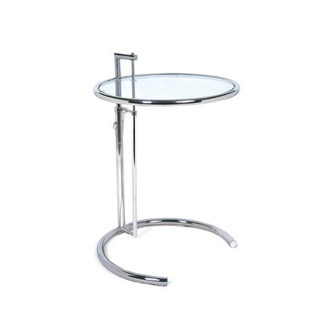 Mesa de diseño, multiusos, estructura de acero inoxidable, parte superior con tapa de cristal. Altura regulable de 56 a 91 cms.