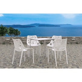 Mesa apilable, armazón de metal acabado epoxi plata, tapa fenólica de 69 x 69 cms. Color blanco. Uso en exteriores e interiores