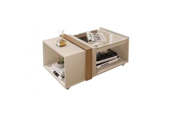 Mesa baja de diseño, cristal, ruedas, blanco roto y miel. Otros acabados disponibles.