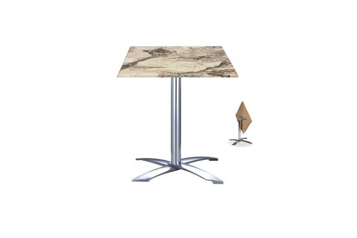 Mesa formada por base de aluminio, abatible, 4 brazos y tapa de 60x60 cms. Color a elegir. Uso en exteriores e interiores