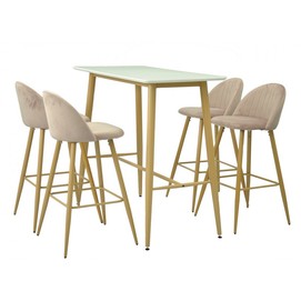Mesa de diseño, alta, armazón de metal con acabado imitación madera, tapa blanca. Taburetes a juego.