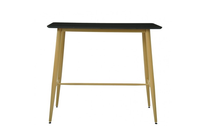 Mesa de diseño, alta, armazón de metal con acabado imitación madera, tapa negra. Taburetes a juego.