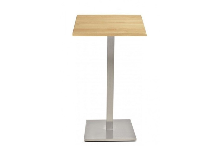 Mesa alta con pie central, acero inoxidable pulido - acabado satinado -. Base de 45 x 45 cms y tapa de 60 x 60 cms, a elegir. Uso en interiores.